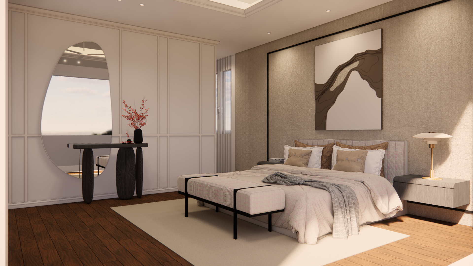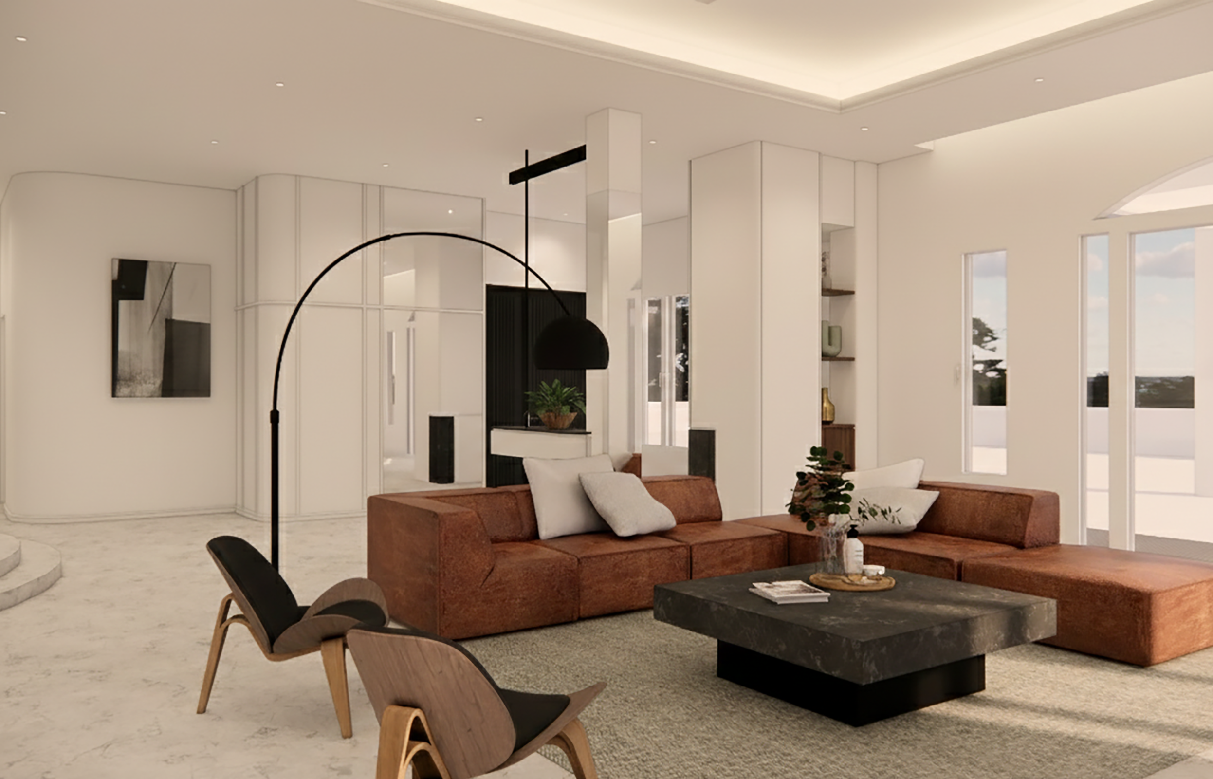 The design for this residence is centered on the concept of "The Sculpted Void" - a study of how minimalist white volumes can be transformed through light, curves, and singular artistic interjections. Rather than filling space with objects, the architecture itself becomes the ornament.