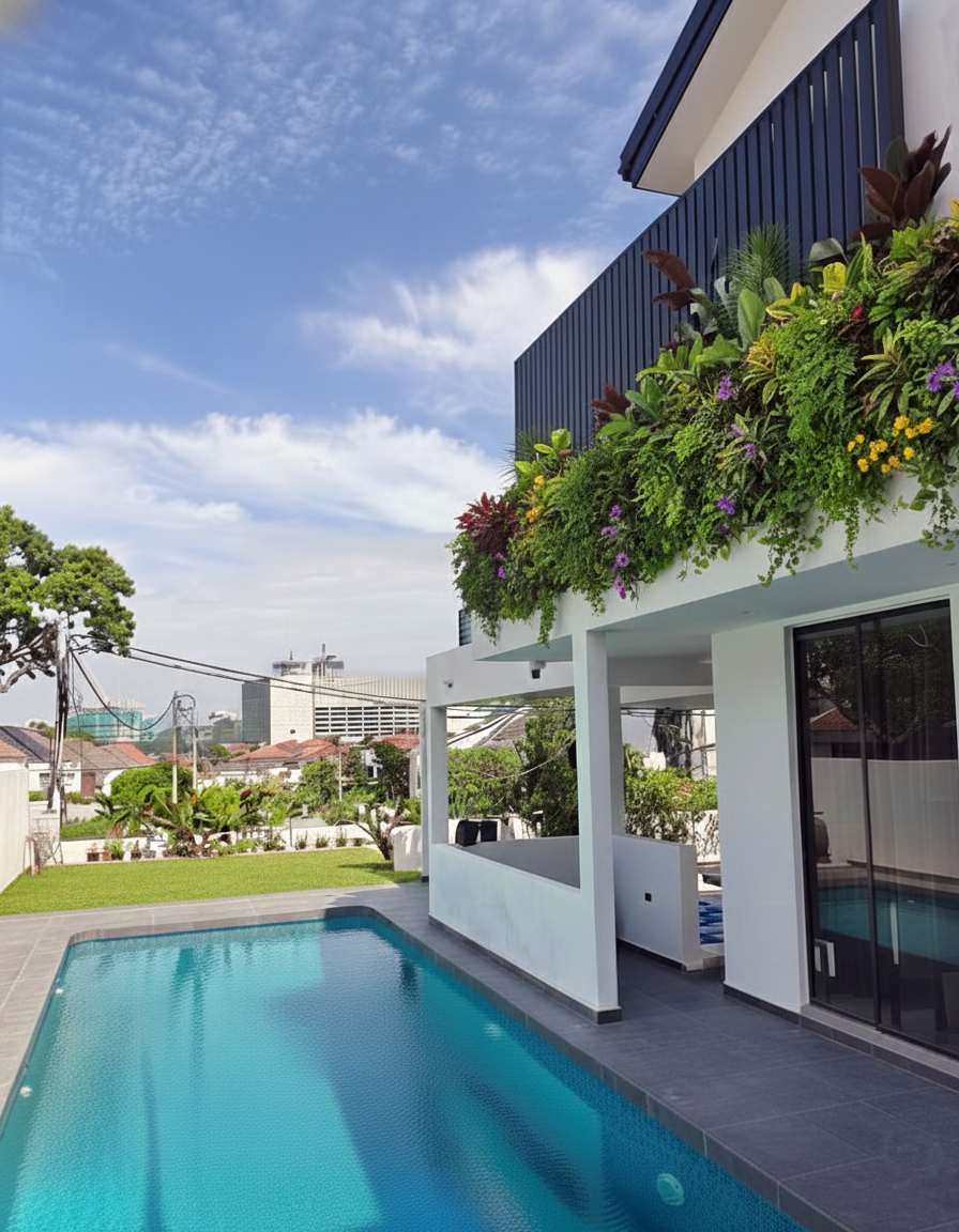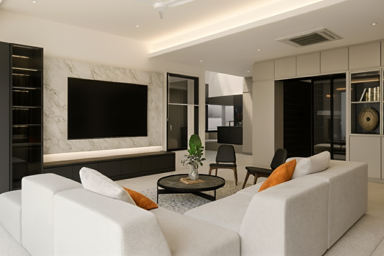 This contemporary two-storey residence showcases a modern minimalist aesthetic with a strong emphasis on geometry, clean lines, and material contrast. The façade is composed of a monochromatic palette - predominantly white and black; creating a bold yet elegant visual balance. The house employs horizontal and vertical linear elements to accentuate proportion and rhythm, while the interplay of light and shadow enhances its architectural depth. The overall composition in the interior reflects balance and rhythm, where every element from the furniture layout to the restrained material palette contributes to an atmosphere of contemporary calm.